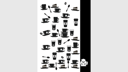A packet of double sided game cards from the game Cafe Counter that displays a messy counter of cafe cups are introduced. Every side of every card depicts a different collection of beverages and treats that include tea cups, coffee mugs, water glasses, togo cups, cakes, spoons, and coffee beans splattered randomly about. The performer asks that the cards be mixed and one be held up. With a mere glance, the performer correctly counts and names the total number of cups and glasses on the card. As an aside the performer also correctly states how many of those cups are filled with coffee and how many of them are orders "togo." Next the performer attempts that this be done with two cards and again successfully and quickly counts the total number with a mere glance. Next more of the cards are used and randomized to the same success, but this time the performer not only counts the total number of cafe cups but also identifies the finer details about the total collection. This can include the number of water glasses, the number of teacups, the number of spoons, number of coffee mugs, number of togo cups and even the total number of cakes! To finish the participant randomizes a final set of cards and counts the cups that are showing in secret and hides the faces of all of the cards from view. Now the total only exists in the participants mind and the performer successfully pulls this final count out of the participants head to a successful conclusion.