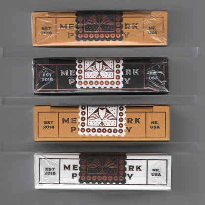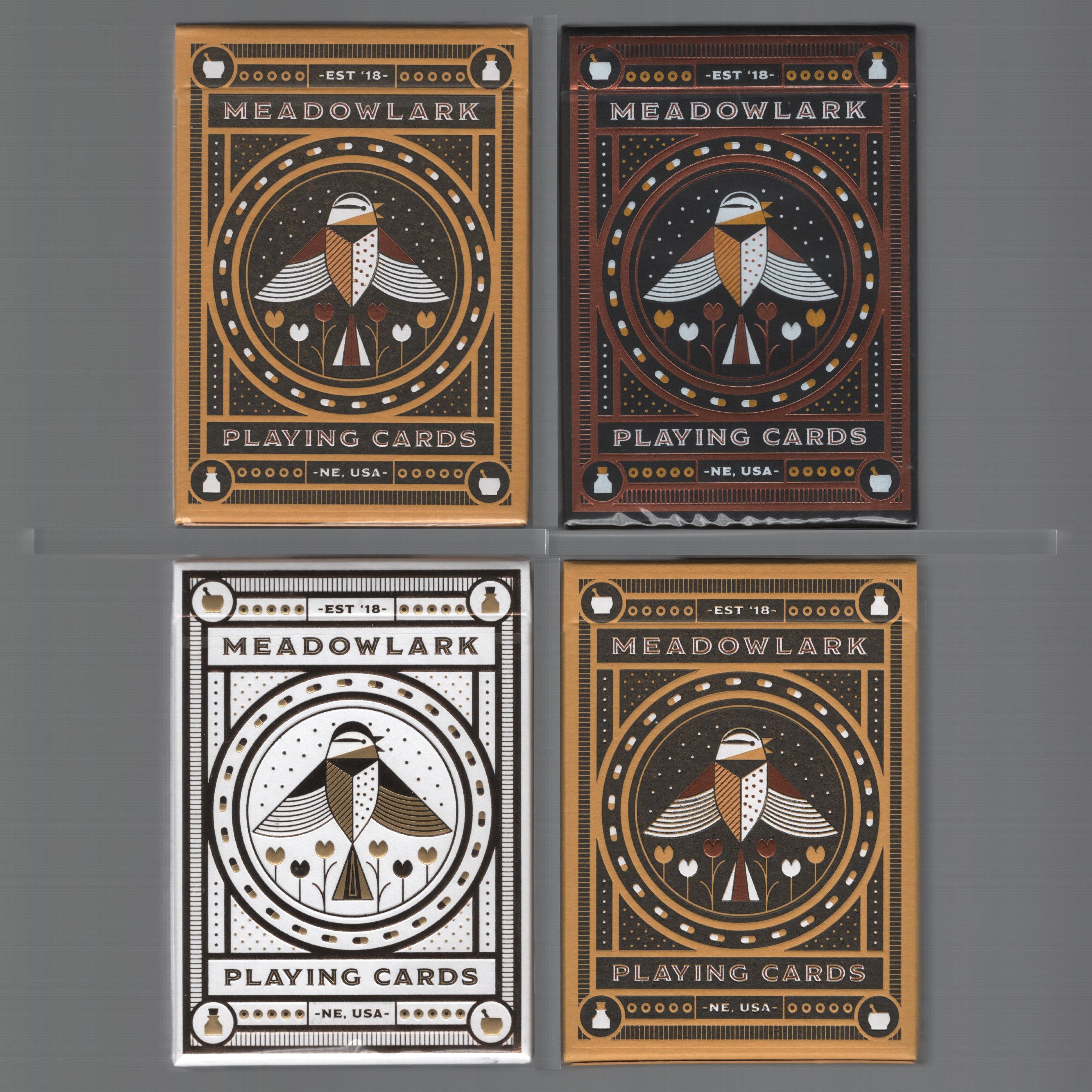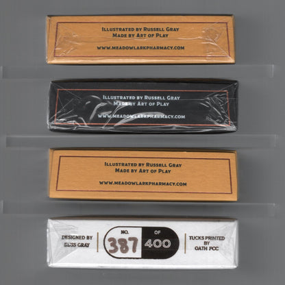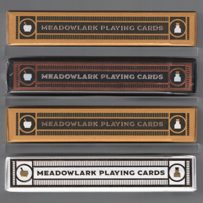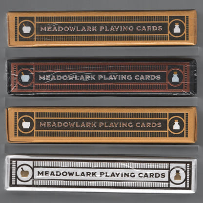 Standard: In 2018 my friend and I opened our own little independent pharmacy in a small Nebraskan town (Hickman). As a way to bring a smile to the faces of our customers, I learned a few VERY SIMPLE card illusions. During the process I fell in love with playing cards, magic, and cardistry. Short story long, I talked to some WONDERFUL individuals (including Brendan Hong and Gio aka Thirdway) and they inspired me to create a deck for the pharmacy. I reached out to an incredible illustrator, Russell Gray, and after almost a year of brainstorming and countless adjustments, we created the Meadowlark Deck. I hope you enjoy it as much as we do. If you find yourself in Lincoln (Nebraska), I encourage you to take a 10 minute detour south and visit the pharmacy. I would love to see your cardistry moves and card illusions! Deck Features Full Custom Deck (Back, Court, Pips, Aces & Jokers) Embossed Foil Printed Tuck Box by St. Clove Press Metallic Copper Ink Traditionally cut Poker size Designed by: Russell Gray Produced by: Art of Play Printed by: USPCC 52 Cards + 2 Jokers