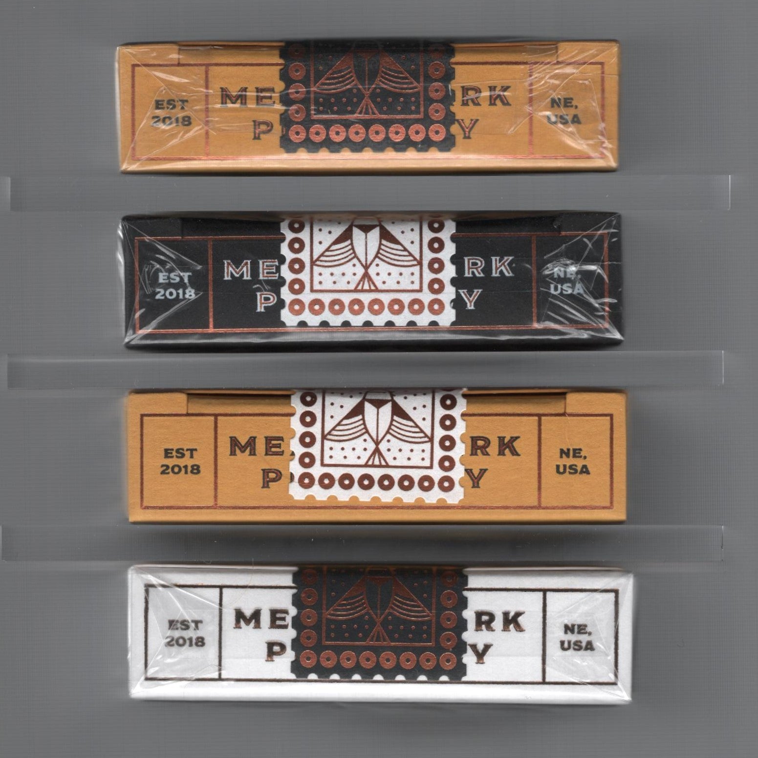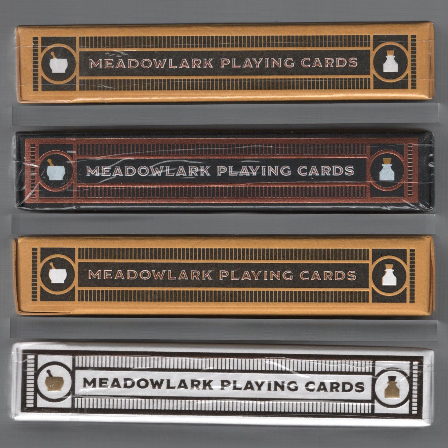 Deluxe: 2020 DOTY Award Nominee: 'Best Tuck', 'Best Rookie Deck'. Custom playing cards created for Meadowlark Pharmacy in Lincoln, Nebraska. Featuring original artwork by Russell Gray. Packaged inside a premium foil-printed tuck box. Sustainably-produced using FSC certified paper and vegetable-based inks on our trademark thin-stock and finish. Printed by the United States Playing Card Co. QUICK OVERVIEW: Copper foil on a black paper stock with the yellow and white as the accent colors. Inside will be a yellow gilded deck! We are doing our best to match the yellow from the deck with the gilding, so it might be more of a yellow gold to make sure that it is shiny.